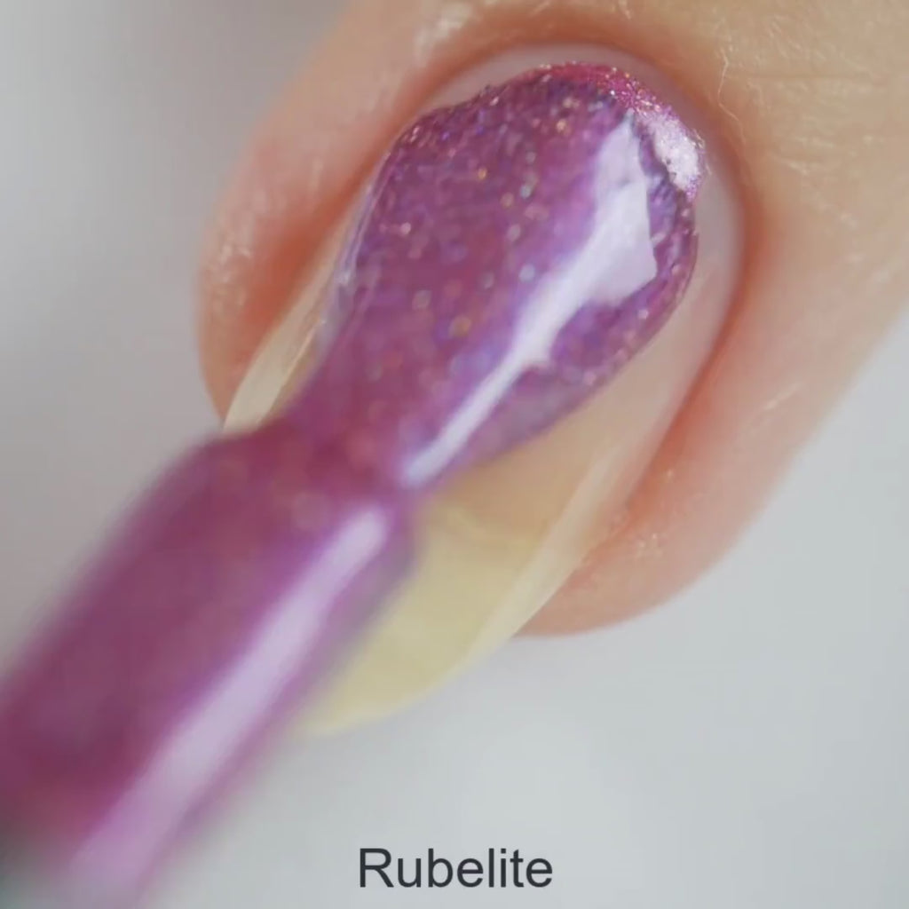 Step into subtle glamor with Rubelite, a mauve shimmer nail polish infused with holographic sparkle that dances in the light. This shade blends timeless elegance with a touch of modern magic, perfect for anyone who wants polish that’s as versatile as it is captivating.