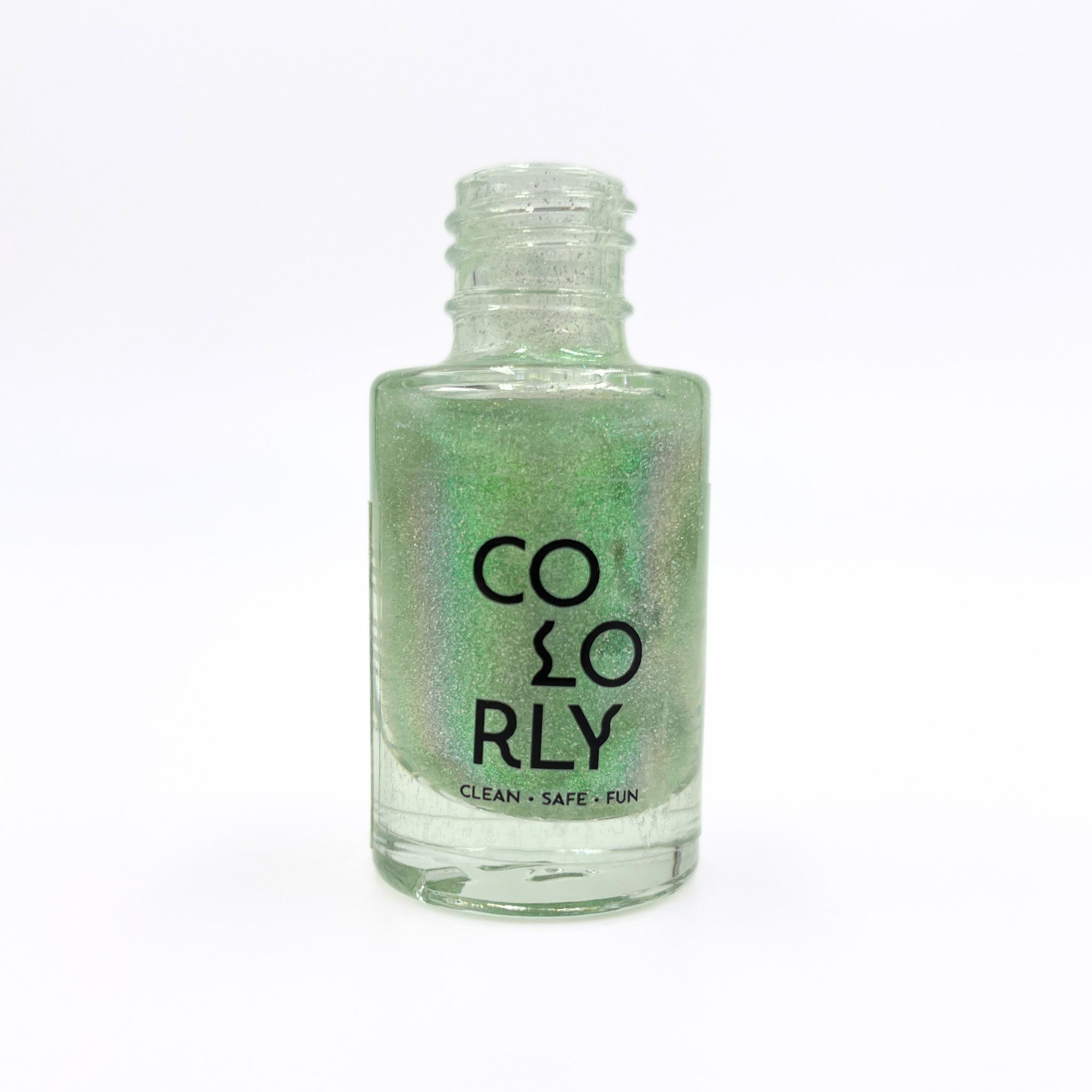 This sheer, pastel green nail polish reveals a soft gold duochrome shift with holographic sparkle that moves like light through leaves. In subtle lighting, it feels fresh and barely there. As it catches the light, a delicate shimmer emerges — like sunlight filtering through a forest canopy.